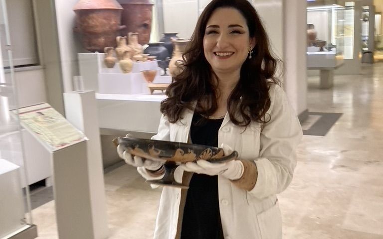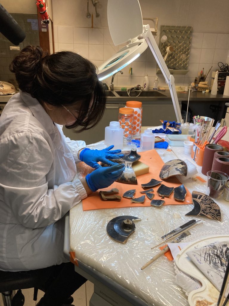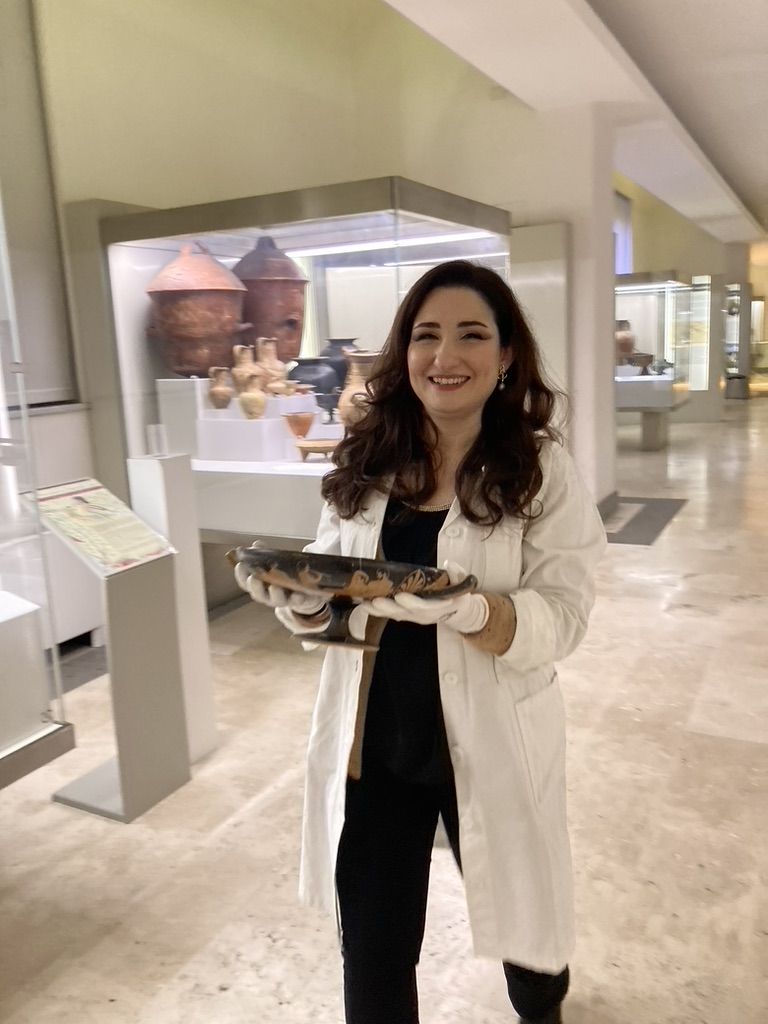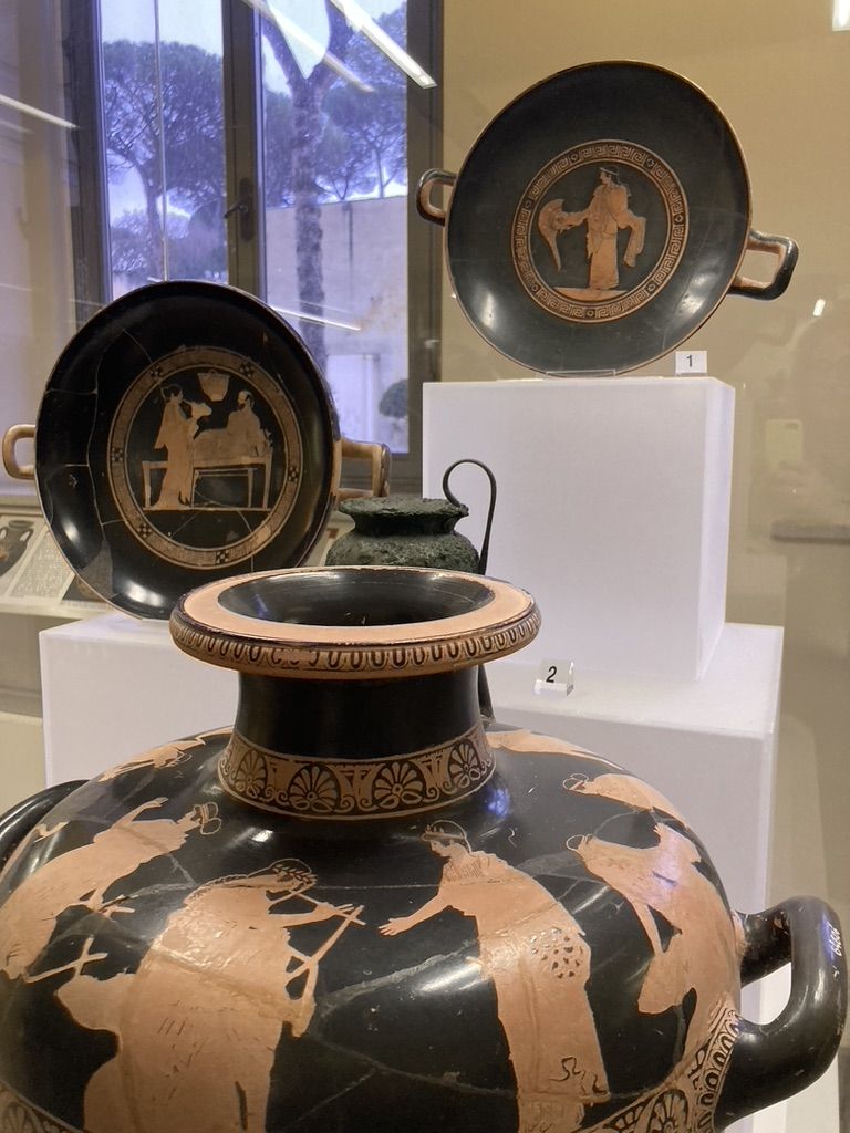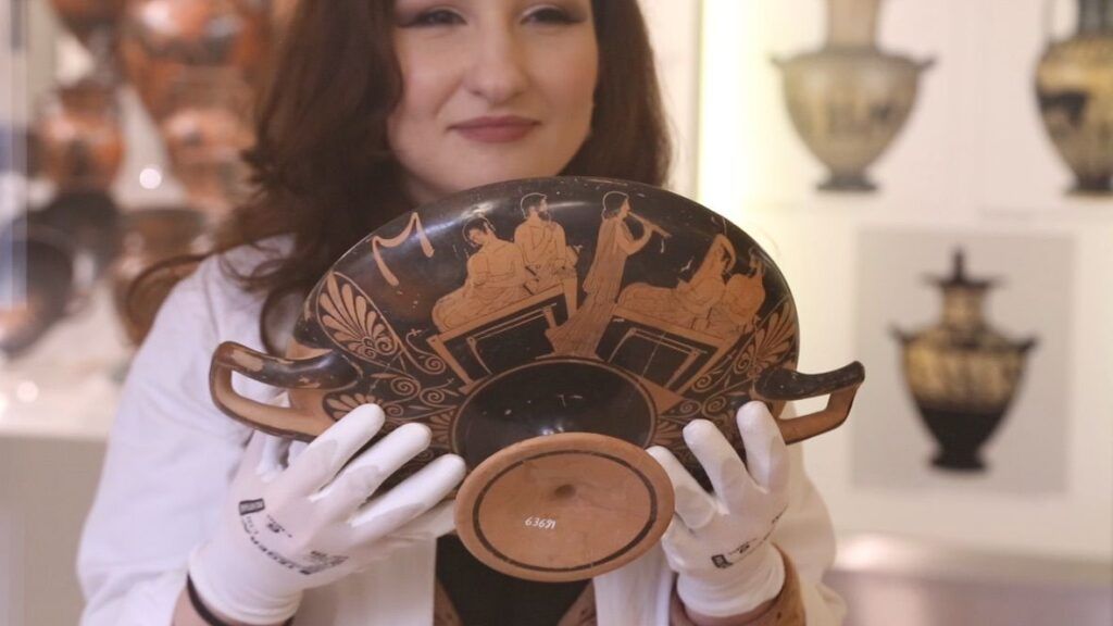 Nazionale Etrusco di Villa Giulia, ripone la kylix del pittore di Euaion nuovamente restaurata nelle teca espositiva del museo.